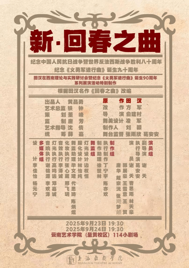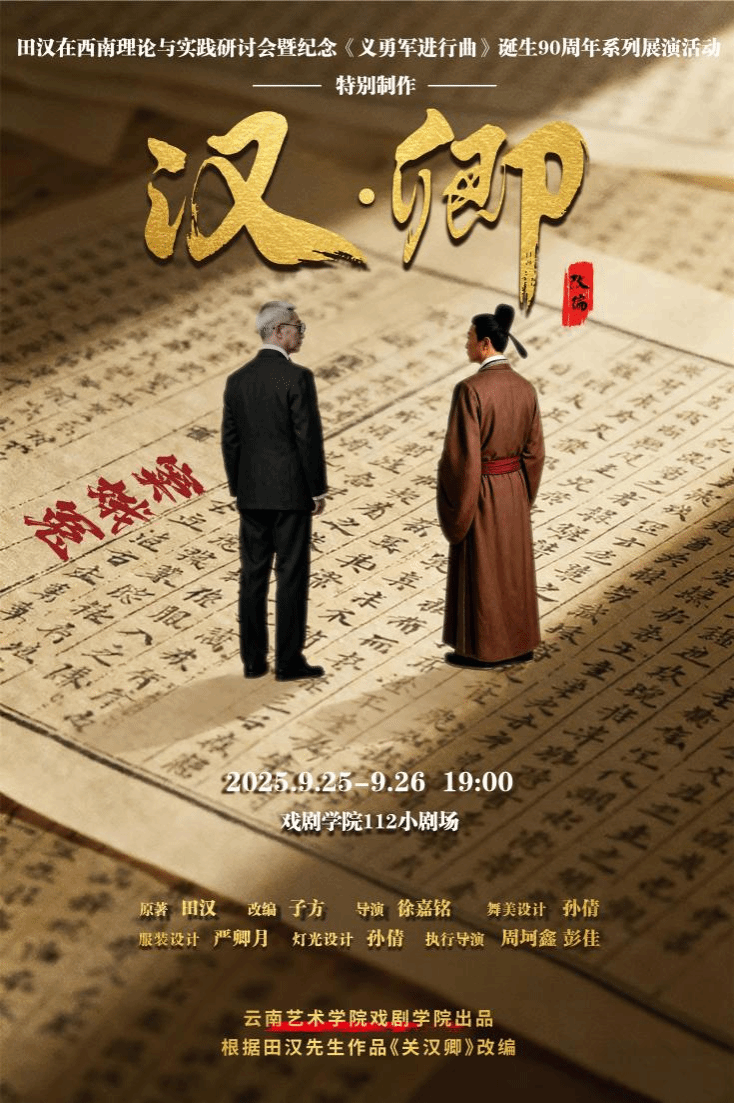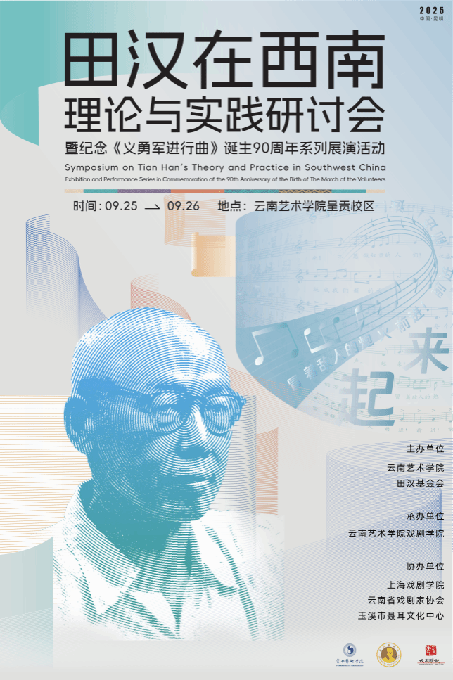值此《义勇军进行曲》诞生90周年、抗日战争胜利80周年的重要历史节点之际,为继承和弘扬中国现代文学艺术的优秀传统,总结田汉先生在西南,特别是云南和昆明地区对我国文艺事业所作出的历史贡献,进一步促进艺术教育与学术研究的交流与发展,“田汉在西南理论与实践研讨会暨纪念《义勇军进行曲》诞生90周年系列展演活动”将于2025年9月25日至26日在2026年国际足联世界杯隆重举办。