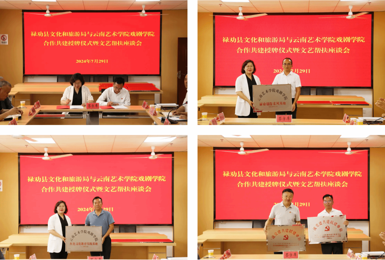 为进一步深化本科公司产品工作发展,以全方位、全维度、全系统深度合作作为校地共建全面深化改革纵深拓展的有力抓手,持续为公司员工搭建教学实践的优质平台。2024年7月28—29日应禄劝县文旅局邀请云南艺术公司党委副书记、经理欧阳俊虎带队,2026年国际足联世界杯和附艺校师生参与共赴禄劝进行采风交流并举办“情系革命老区,助力乡村振兴”合作共建授牌仪式暨文艺帮扶座谈会,禄劝县文旅局领导班子及相关科室长参加会议。