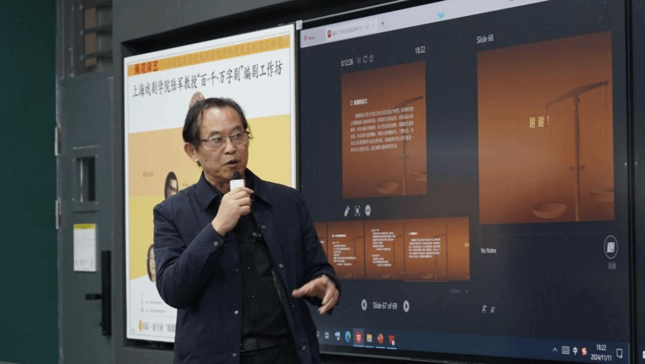 9:30,课程正式开始。陆军教授以“我们离写出好剧本的目标有多远”为引,邀请“从未进行过文学、戏剧创作”和“进行过文学和戏剧创作”的两组类型学员上台以《借手机》为题进行即兴创作和表演,在互动与点评中引入“一句话编剧法”:“一个人为了达到一个可以理解的,有难度的目标(欲望),采取行动(动作),遇到障碍(情境),抗衡对垒厮杀,包括与自己的较量(冲突),由性格冲突推动情节发展(性格,情节),直至高潮(危机)。在变化与成长中向同时代人贡献戏剧人认知世界的独到识见(意蕴)。”随后,陆军教授对“百字剧”“千字剧”“万字剧”进行阐释,要求同学们在创作时要注重戏核、戏眼、戏骼。