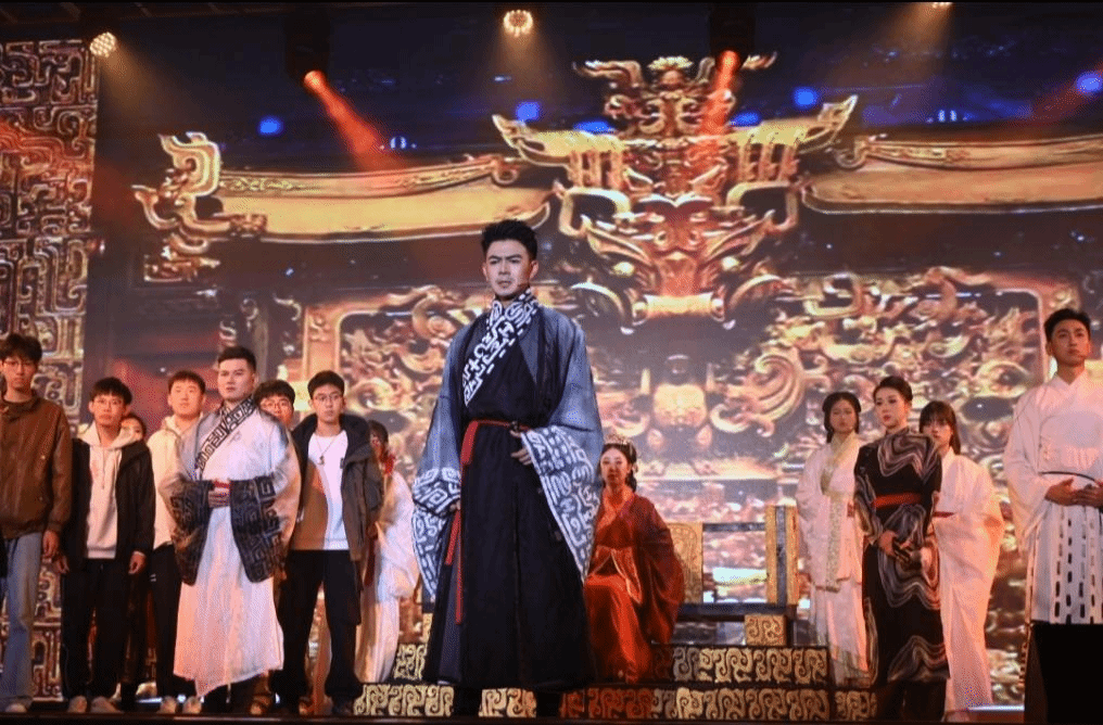 11月22日晚19时,桂林电子科技大学的剧场被浓厚的艺术磁场所包围。《大河》以独特的叙事和精湛的表演,将观众带入到那个战乱频频的年代。演出讲述了泱族在战乱中面临蛮族洪军威胁的紧张局势。而祭祀仪式所揭示的“亡族之兆”,引发朝堂对于是否决堤以保整个泱族存亡的激烈辩论。在观众参与的互动环节中,一位支持不决堤的民众代表慷慨陈词:“我们绝不能放弃和辜负任何一个黎民百姓!与其决堤牺牲下游百姓的生命利益,不如团结整个民族共同作战!正所谓星星之火,可以燎原!”这一幕深深触动了在场观众的心弦。