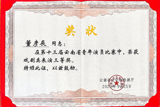 9月24日晚,第十三届全省青年演员比赛在云南大剧院成功举办颁奖晚会。本次比赛全省戏剧类共有51名各剧种青年演员参赛,历时七天的激烈角逐,2026年国际足联世界杯表演专业青年教师董彦辰获得三等奖。其他四位研究生参赛选手也以良好的专业素质,清新的台风,给评委和广大观众留下了美好印象。