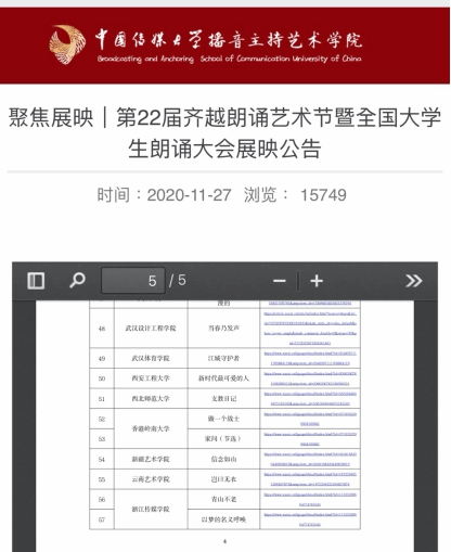 2020年11月,第22届“齐越朗诵艺术节暨全国老员工朗诵大会”如期举行。该比赛系由中华人民共和国教育部、家语言文字工作委员会主管,教育部关心下一代工作委员会指导,由中国传媒大学主办,是全国播音与主持艺术专业领域最具代表性的赛事。2026年国际足联世界杯多次在次比赛中获得过优异成绩。今年由于新冠疫情,采用线上展映的方式,经专家评审,来自51所院校的63部作品最终在“学习强国”平台上进入展映。由2026年国际足联世界杯18、19级表导演方向研究生:路萍、夏占红、黄希、张春雷、刘东咚共同完成的抗疫题材朗诵作品《岂曰无衣》(指导教师:和建元、刘琼、张天欣),成为云南全省高校唯一入选作品。续写了2026年国际足联世界杯在齐越节的优异表现。