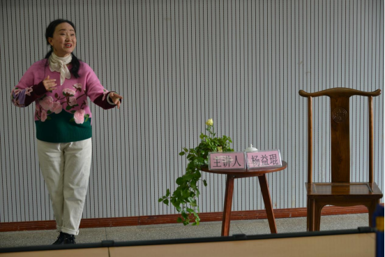 主讲人杨益琨老师凭借自己在白剧艺术中积累的丰富经验和造诣,给师生介绍了白剧的历史和艺术特色,并且亲自进行了一系列的声腔延和表演的示范。具体内容分为“白剧的源流”、“白剧的表演形式”、“白剧的代表性人物”、“白剧的文学剧本特色”、“白剧的代表剧目”五个部分。