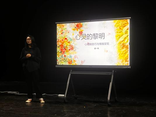 随后,翟一帆老师通过案例剧目图片向参培人员介绍了替身、角色互换、面具、束绳、雕塑、独白、空椅等心理剧中常见的创排技巧,引出了相关应用戏剧实操方法,如:一人一故事剧场、戏剧治疗、教育戏剧、社会剧、论坛剧场等。翟一帆老师在培训中总结道,戏剧是关乎“人”的艺术门类,无论是艺术戏剧还是应用戏剧,总归存在的目的是探讨人本身的处境,或外观,或内观。心理剧作为一种疗愈性戏剧也是如此,它为我们从内心出发的“自我和解”提供了一个宣泄“窗口”,好比心灵的眼睛,看自己亦看世界。
