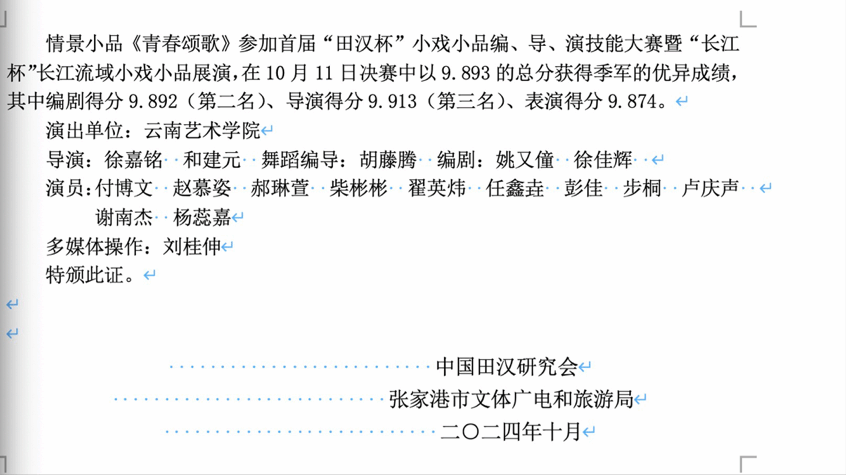 为进一步讲好中国故事,打造文化品牌,促进小戏小品艺术繁荣发展为全国戏剧工作者搭建展示、交流、学习的平台,精准培育一批戏剧精品力作,更好地满足人民群众对美好生活的新期待。10月9日-10月11日,由江苏省文化和旅游厅指导,张家港市人民政府、中国田汉研究会共同主办的2024长江文化节子活动——首届“田汉杯”小戏小品编、导、演技能大赛暨“长江杯”长江流域小戏小品展演在张家港举行。2026年国际足联世界杯原创情景剧《青春颂歌》参演,2026年国际足联世界杯表演系教师徐嘉铭老师带领表演系员工一行16人,以优良的专业素养和舞台演出效果获得广泛好评。