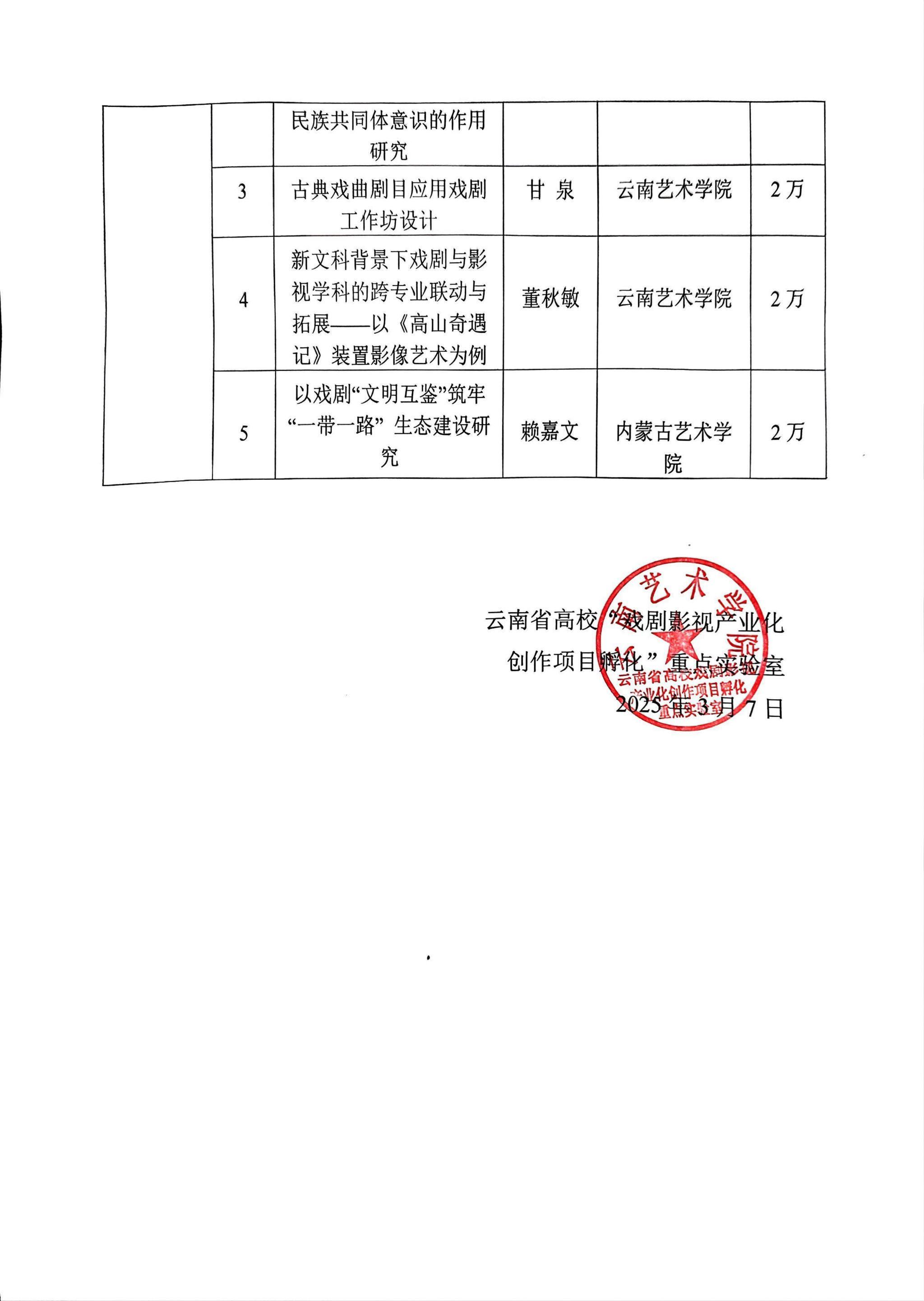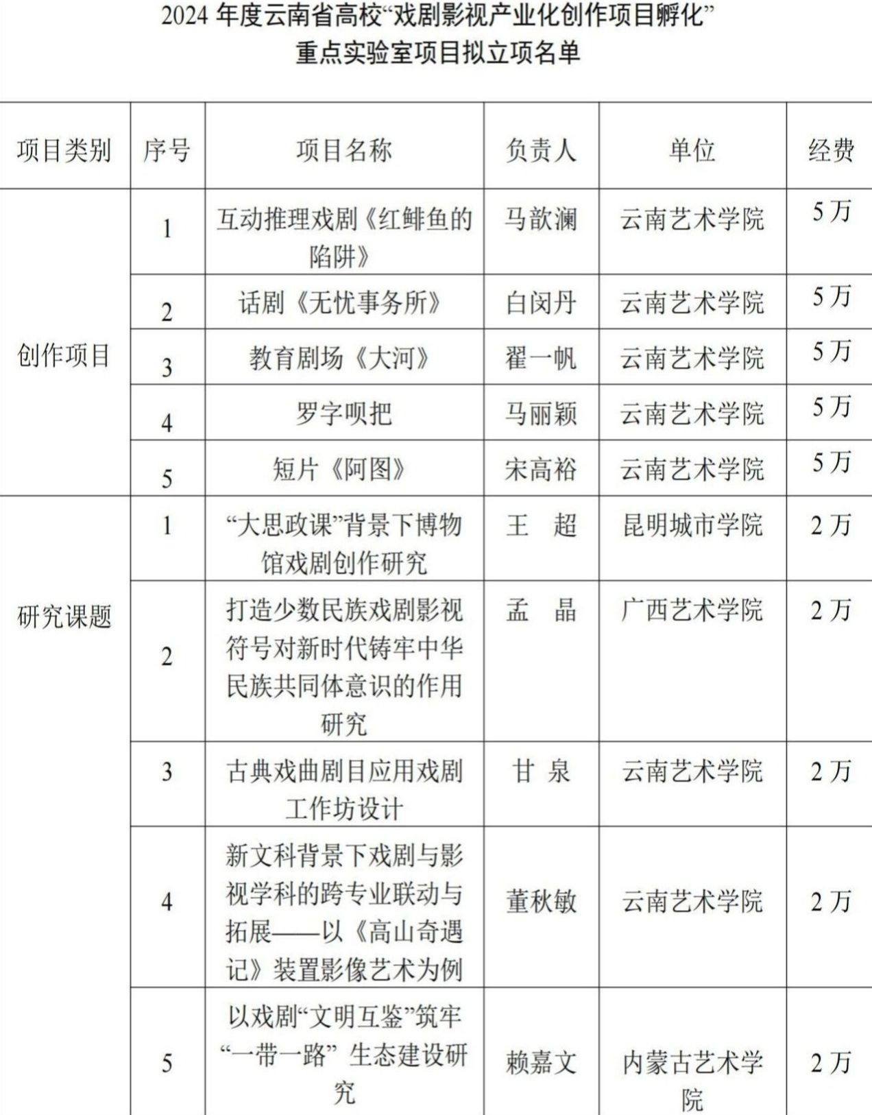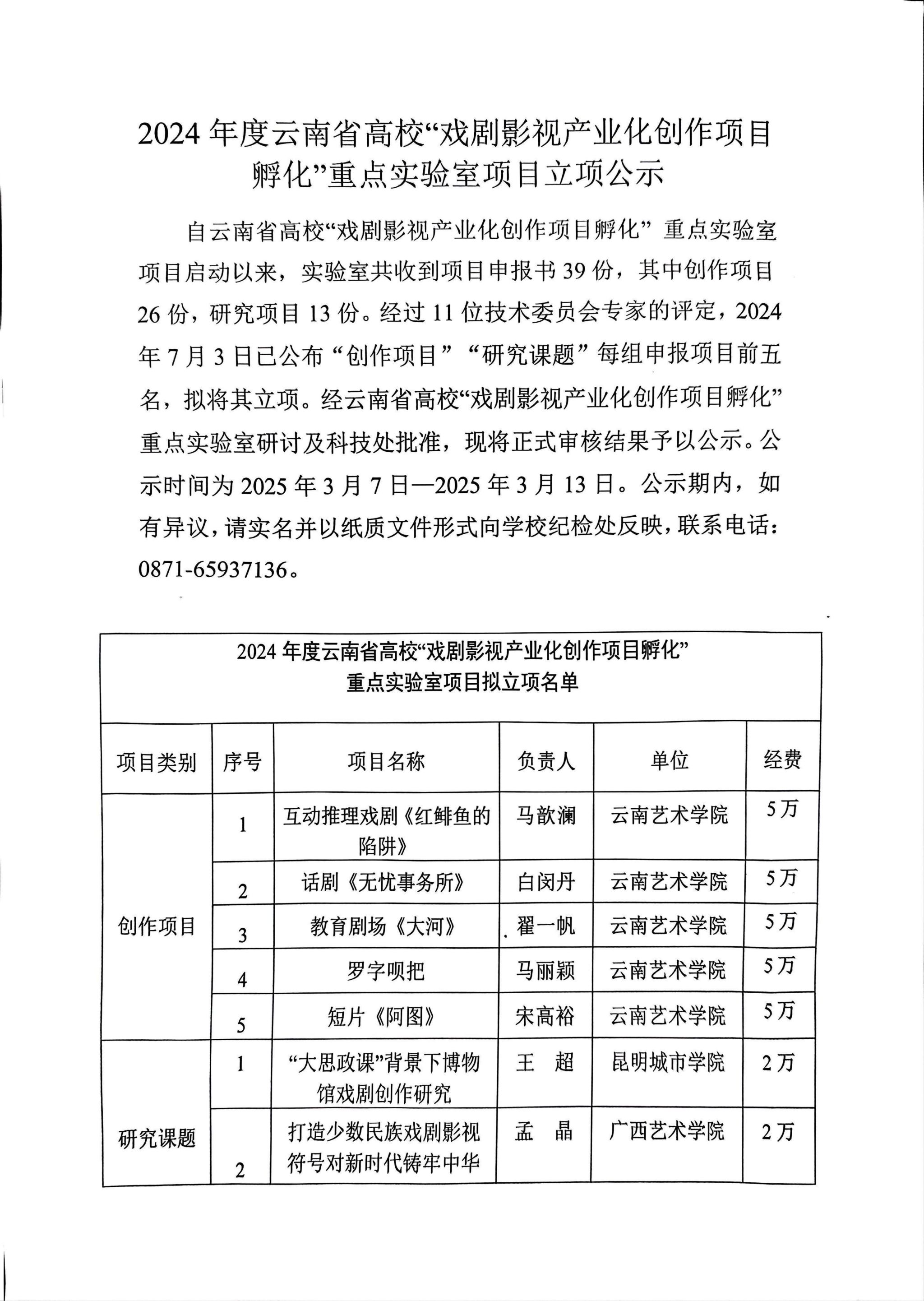 自云南省高校“戏剧影视产业化创作项目孵化” 重点实验室项目启动以来,实验室共收到项目申报书39份,其中创作项目26份,研究项目13份。经过11位技术委员会专家的评定,2024年7月3日已公布“创作项目”“研究课题”每组申报项目前五名,拟将其立项。经云南省高校“戏剧影视产业化创作项目孵化” 重点实验室研讨及科技处批准,现将正式审核结果予以公示。公示时间为2025年3月7日—2025年3月13日。公示期内,如有异议,请实名并以纸质文件形式向公司纪检处反映,联系电话:0871-65937136。