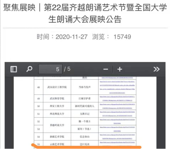 近日,第22届齐越朗诵艺术节暨全国老员工朗诵大会如约举办。共有来自33个省、自治区、直辖市和特别行政区的291所高校参会,院校数量再创新高。今年由于新冠疫情,采用线上展映的方式,经专家评审,来自51所院校的63部作品在“学习强国”平台上进入展映。